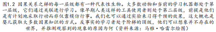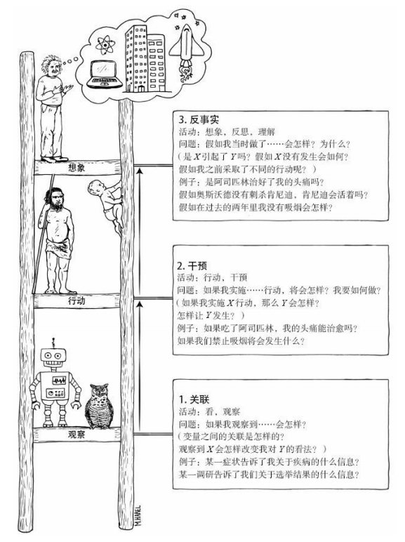 因果关系的学习者必须熟练掌握至少三种不同层级的认知能力:观察能力(seeing)、行动能力(doing)和想象能力(imagining)。