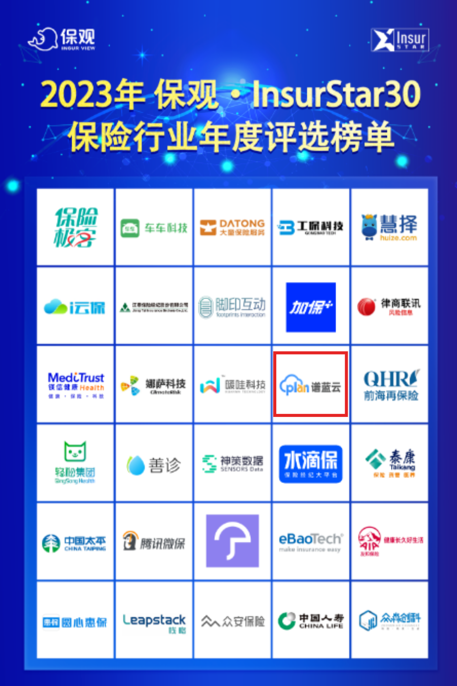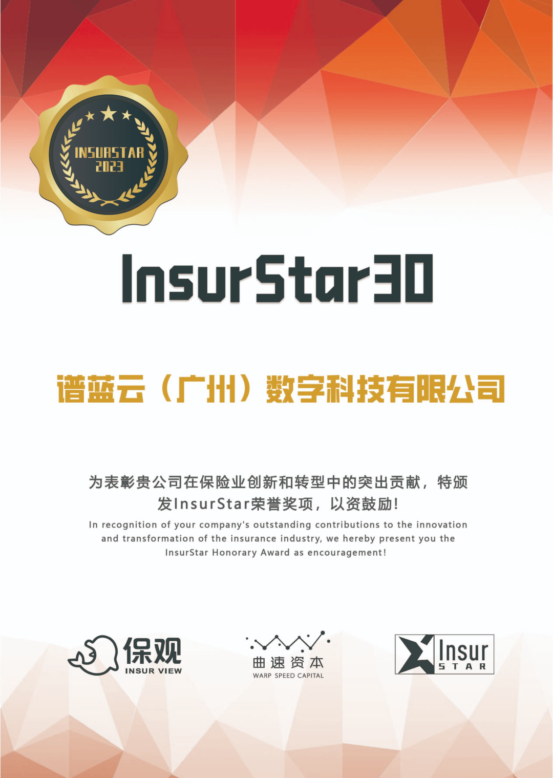 2023年12月28日,知名保险行业媒体《保观》公布“2023年保观·InsurStar30保险行业年度评选榜单”,谱蓝云(广州)数字科技有限公司荣获InsurStar30奖项。